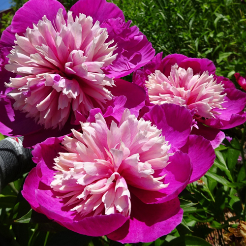 - двухцветный пион с цветком в диаметре 15 см, окрас светло-розовый в сочетании с ярко-малиновым цветом (см. фото);
